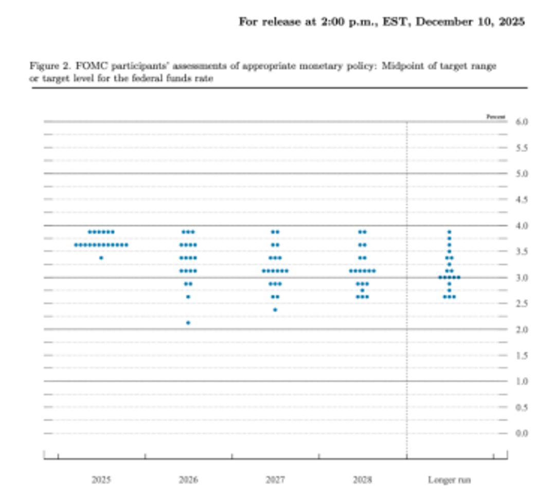 备受关注的未来政策预测“点阵图”显示,最新发布的点阵图预测显示,多数美联储官员预计在2026年和2027年各有一次25个基点的降息。美联储的中值预测显示,2026年利率为3.4%,2027年为3.1%,与9月份预测一致。有七位美联储官员预计,2026年不会降息,四位美联储官员预测数字显示在2026年有两次25个基点的降息。