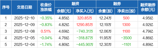 融资方面,当日融资买入4256.59万元,融资偿还3935.73万元,融资净买入320.85万元。融券方面,融券卖出1600股,融券偿还1100股,融券余量12.24万股,融券余额973.09万元。融资融券余额合计4.95亿元。