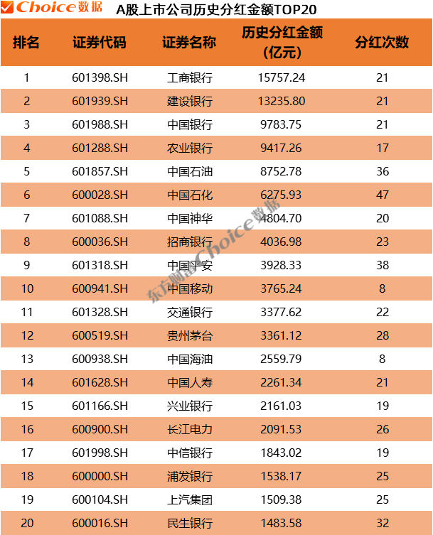 在A股历史分红榜上,工商银行上市以来累计分红21次,分红金额1.58万亿元,排名第一。紧随其后,建设银行累计分红金额1.32万亿元;中国银行、农业银行、中国石油、中国石化累计分红金额也都超过6000亿元。
