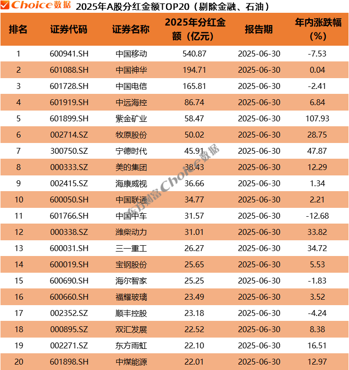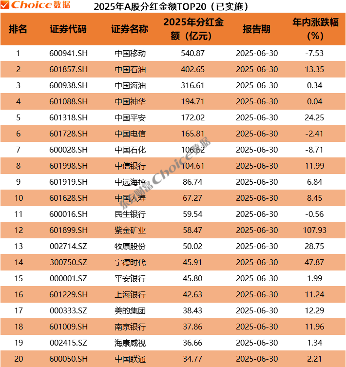 2025年以来,已实施分红的A股上市公司共有8家分红总额超百亿元。其中,中国移动中报分红540.87亿元,位列分红榜第一名;中国石油中报分红402.65亿元,位列第二名;中国海油排名第三,分红316.61亿元。此外,中国神华、中国平安、中国电信、中国石化、中信银行分红金额均超过百亿元。