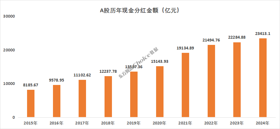 随着上市公司分红制度的不断完善,现金分红越来越成为A股上市公司常态化选择。Choice数据统计,自2022年以来,A股已连续3年现金分红金额超2万亿元,且持续保持上升势头。
