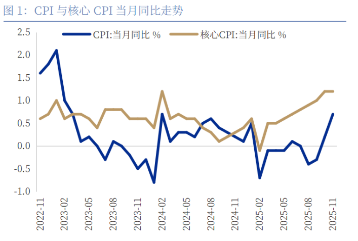 展望后市,CPI回升需关注以下两个方面:一是随着南方本地菜逐步上市、北方设施蔬菜供应增加,市场供需紧张局面有望局部缓解,因此后续的蔬菜价格涨幅可能不及11月,考虑到猪肉对CPI的拖累仍在延续,鲜果价格增长较为平稳,食品CPI的拖累可能略有放大。二是扩内需政策下部分消费品需求前置导致价格呈现走弱的态势,或需进一步扩大国补使用范围,并强化服务消费相关政策,才能更持续地带动消费品和服务价格回升。考虑到“十五五”规划将“扩大优质消费品和服务供给”列为扩大内需战略的关键支撑,因此我们对后续CPI的回升持谨慎乐观的预期。
