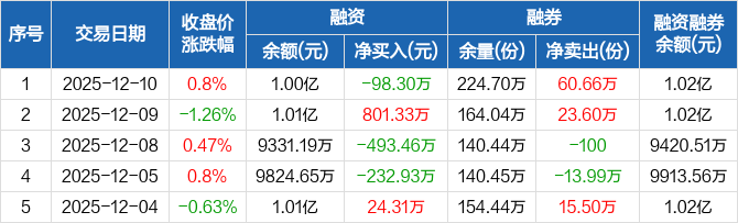 养殖ETF:融资净偿还98.3万元,融资余额1亿元(12-10)