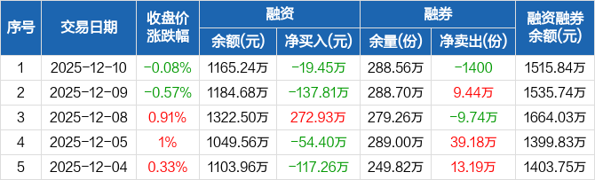 A500ETF南方:融资净偿还19.45万元,融资余额1165.24万元(12-10)