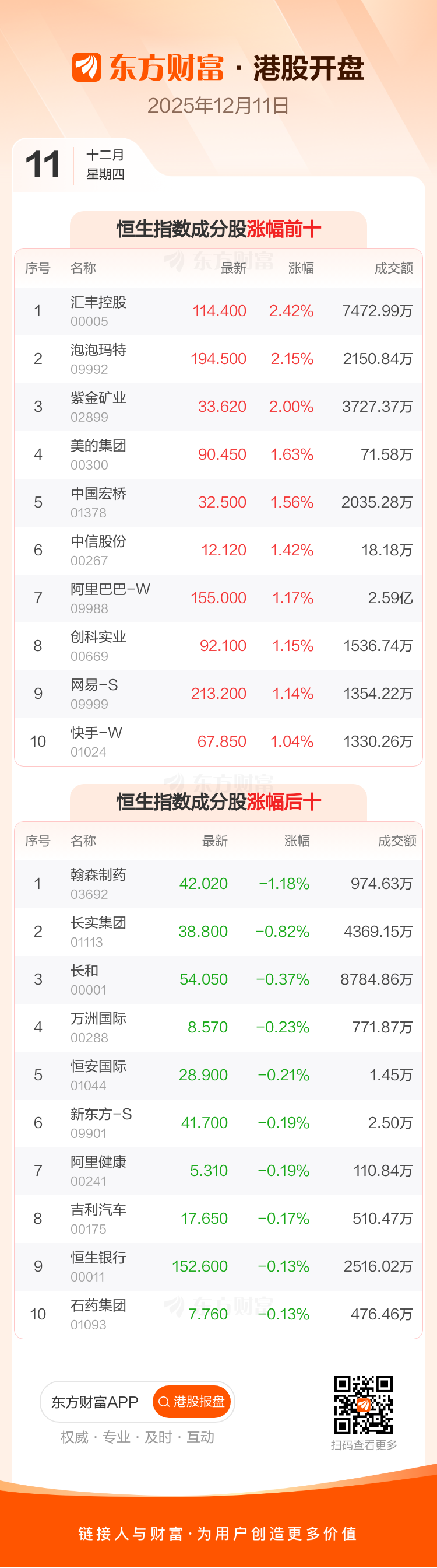12月11日港股开盘:恒指高开0.66% 汇丰控股领涨成分股