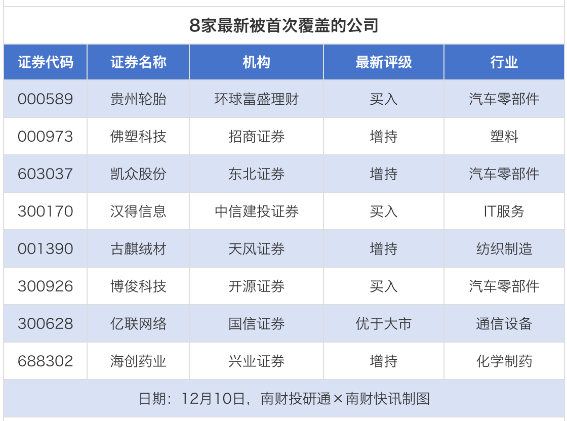 首次覆盖方面,12月10日券商共给出了8次首次覆盖,其中贵州轮胎获得环球富盛理财给予“买入”评级,佛塑科技获得招商证券给予“增持”评级,凯众股份获得东北证券给予“增持”评级,汉得信息获得中信建投证券给予“买入”评级,古麒绒材获得天风证券给予“增持”评级。