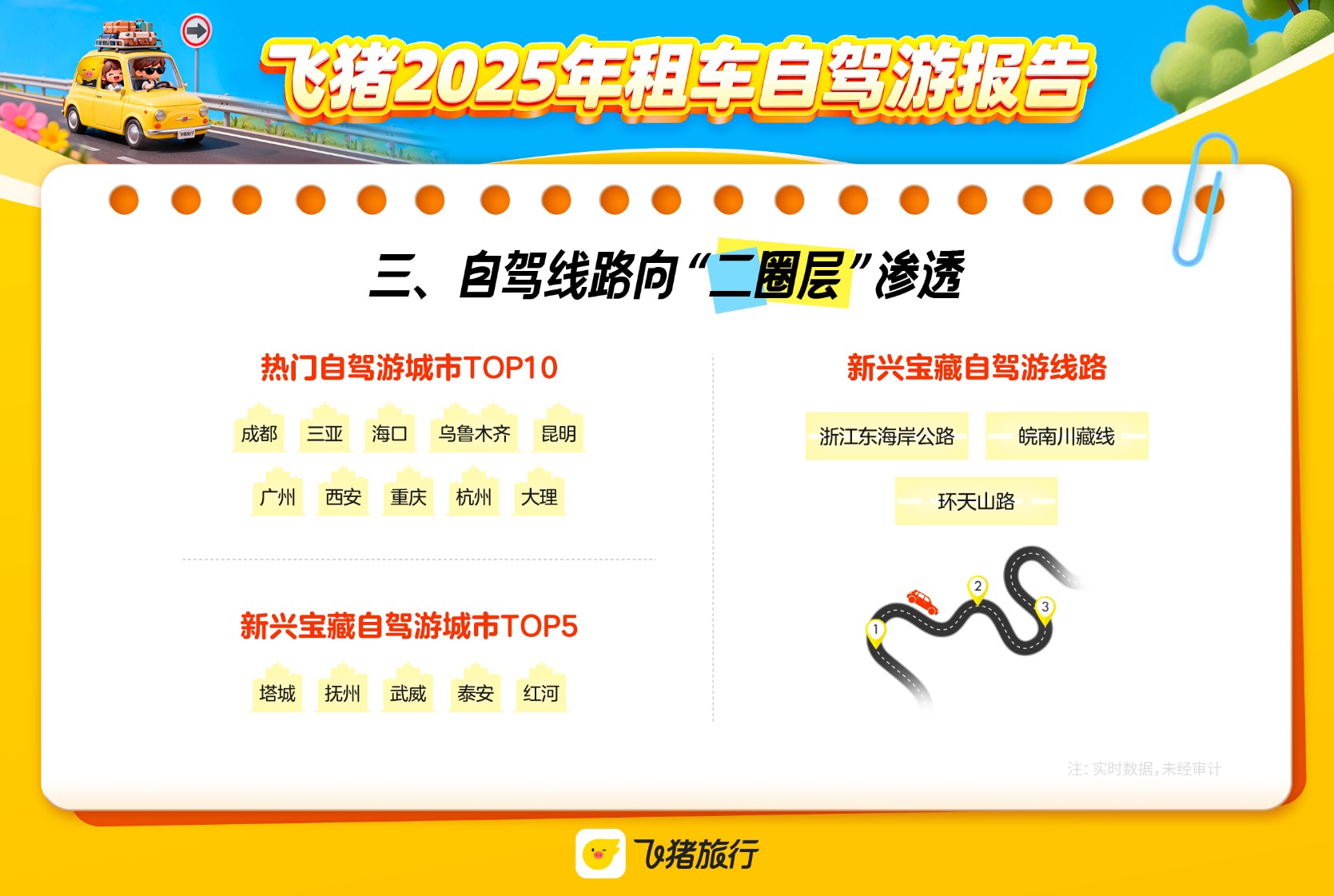 风景在路上,自驾看山海的旅行方式成为年轻人的主流选择。12月10日,飞猪发布的2025年新旅行洞察系列之《租车自驾游报告》显示,2025年平台上的租车订单量保持强劲增长态势,90后用户规模继续扩大,占比接近五成;00后用户增速更快,订单量同比去年增长近40%。