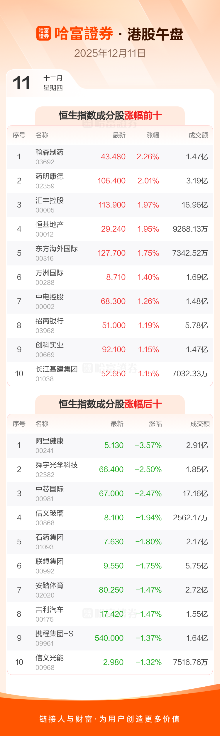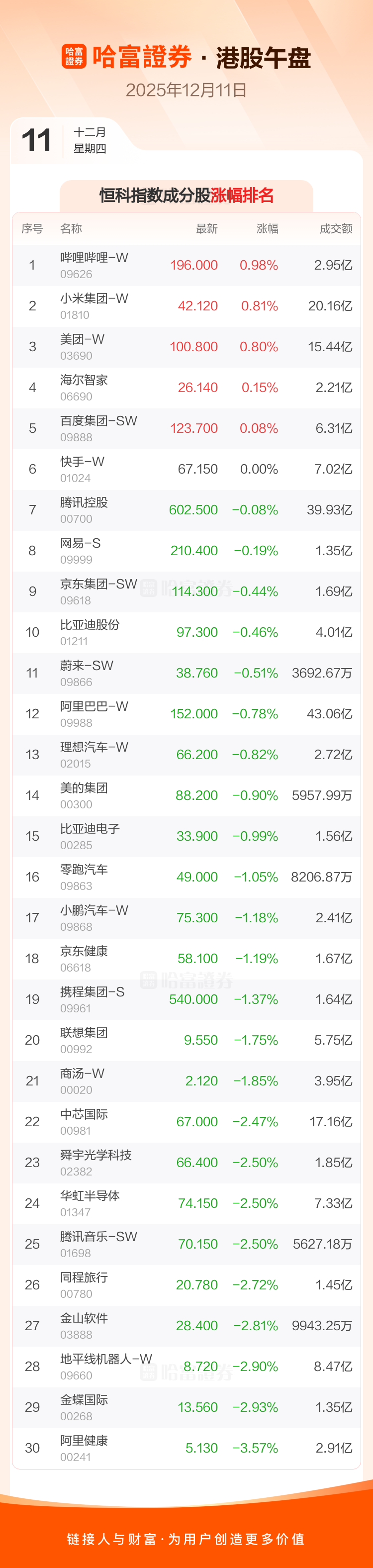 港股12月11日午盘走高,恒生指数收报25563.16点,涨22.38点,涨幅0.09%;恒生科技指数收报5544.66点,跌36.44点,跌幅0.65%。恒生指数成分股中翰森制药、药明康德、汇丰控股涨幅居前,阿里健康、舜宇光学科技、中芯国际跌幅靠前。恒生科技指数成分股中哔哩哔哩-W、小米集团-W、美团-W涨幅居前,阿里健康、金蝶国际、地平线机器人-W跌幅靠前。