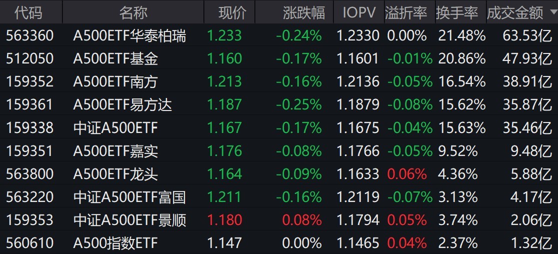 截至上午收盘,场内跟踪中证A500指数的ETF涨跌互现。其中,有10只中证A500相关ETF成交额超1亿元,3只超38亿元。A500ETF华泰柏瑞、A500ETF基金、A500ETF南方早盘成交额分别为63.53亿元、47.93亿元、38.91亿元。