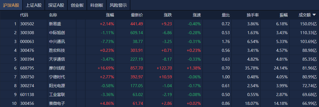个股方面,新易盛成交额超150亿元居首,中际旭创、中兴通讯、胜宏科技成交额靠前。