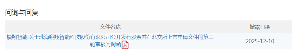 北交所网站显示,12月10日,北交所对珠海锐翔智能科技股份有限公司公开发行股票并在北交所上市的申请文件发出第二轮审核问询函,问询直指公司收购子公司定价悬殊、大客户依赖加剧、收入确认时点前移、募投用地尚未到手等关键问题。