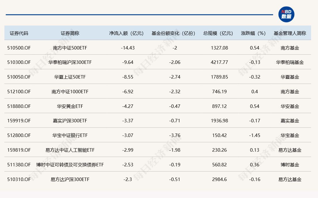 与此同时,南方中证500ETF份额减少2.00亿份,对应净流出14.43亿元;华泰柏瑞沪深300ETF份额减少2.06亿份,录得净流出9.64亿元;华夏上证50ETF份额减少2.74亿份,出现净流出8.55亿元。