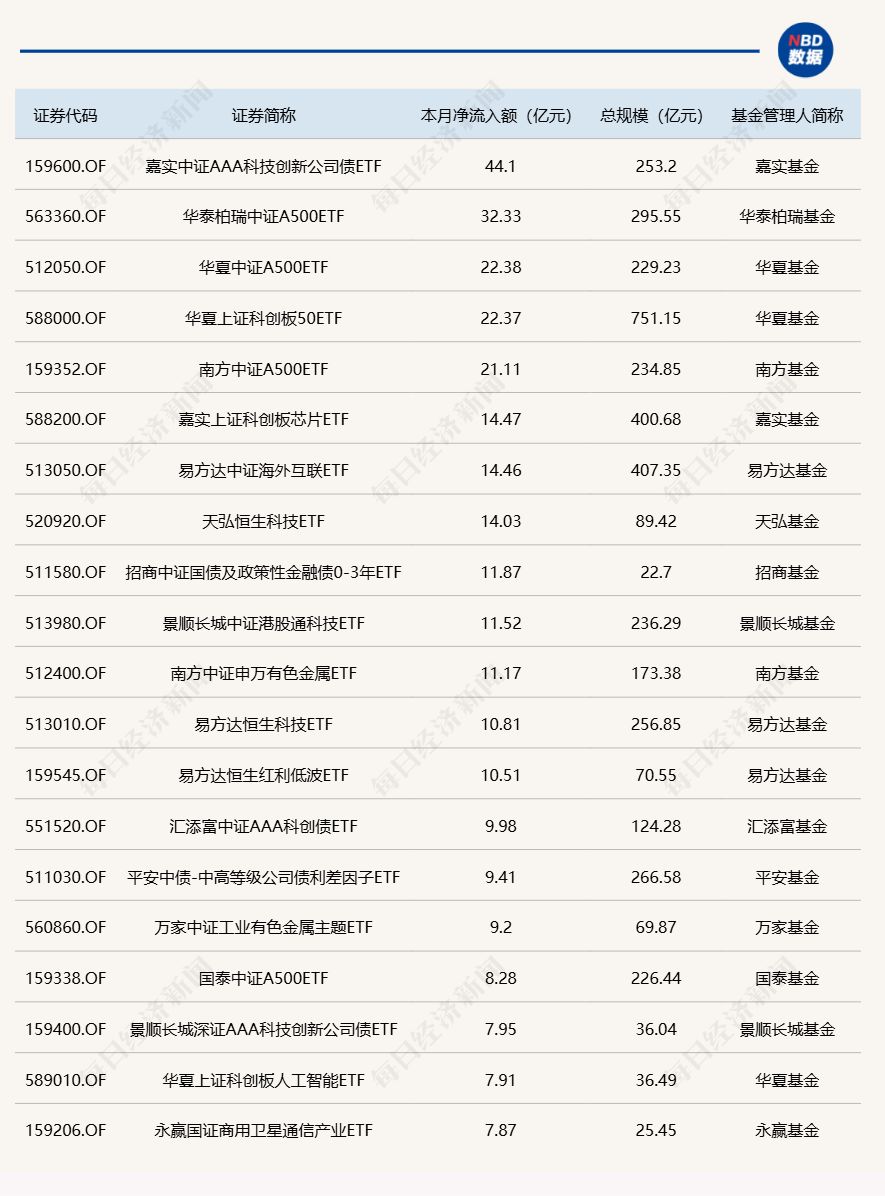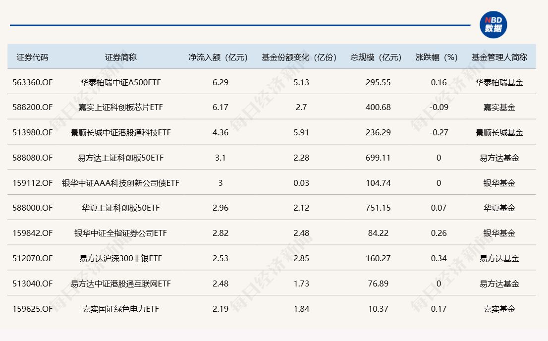 ETF规模速报 | A500ETF华泰柏瑞、科创芯片ETF昨日净流入均超6亿元