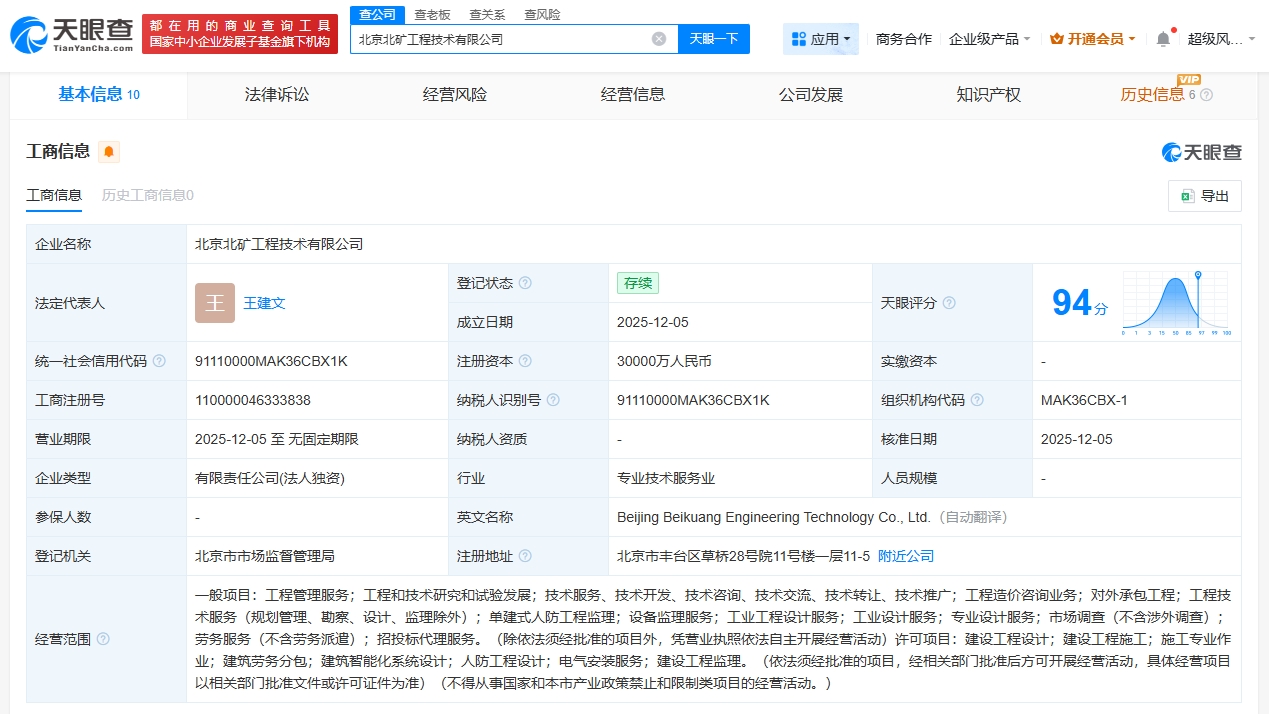每经AI快讯,天眼查App显示,近日,北京北矿工程技术有限公司成立,法定代表人为王建文,注册资本3亿元人民币,经营范围包括工程管理服务、工程和技术研究和试验发展、建筑智能化系统设计等。股东信息显示,该公司由矿冶科技集团有限公司全资持股。
