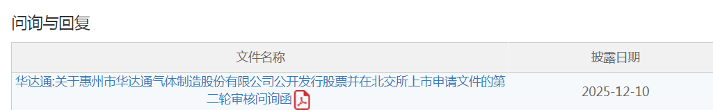 北交所网站显示,12月10日,北交所对惠州市华达通气体制造股份有限公司(以下简称“华达通”)的第二轮审核问询函公开“出炉”,监管在次轮问询中聚焦收入确认、成本差异、募投合理性、持续经营能力等关键问题。