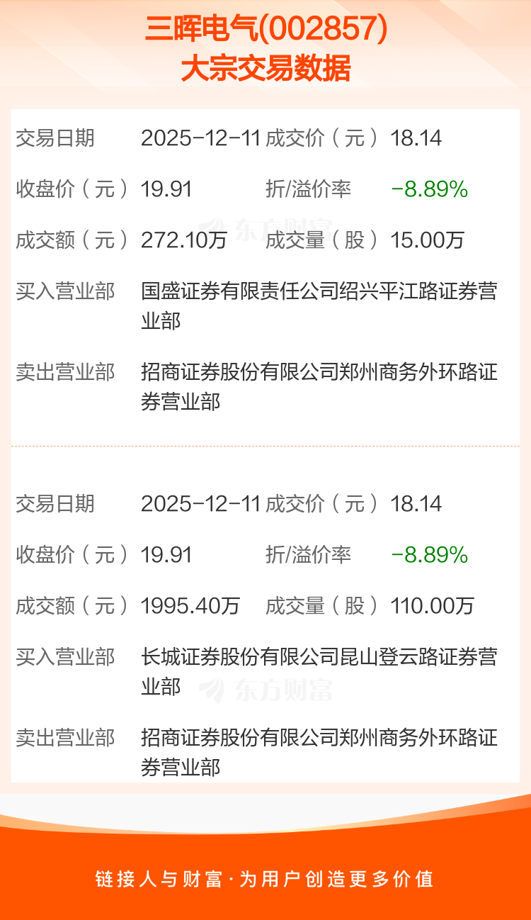 2025年12月11日,三晖电气发生2笔大宗交易,共成交125.00万股,成交金额2267.50万元,占其流通市值比例为0.89%。