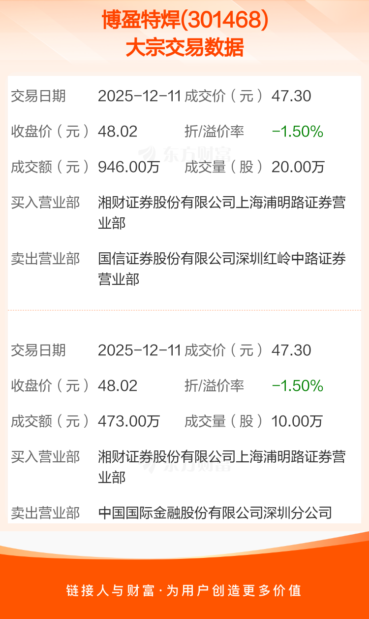 2025年12月11日,博盈特焊发生2笔大宗交易,共成交30.00万股,成交金额1419.00万元,占其流通市值比例为0.39%。