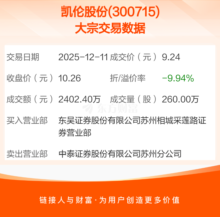2025年12月11日,凯伦股份发生1笔大宗交易,共成交260.00万股,成交金额2402.40万元,占其流通市值比例为0.70%。