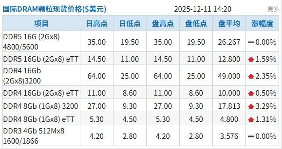 DDR4 16Gb (2Gx8)3200均价达49美元