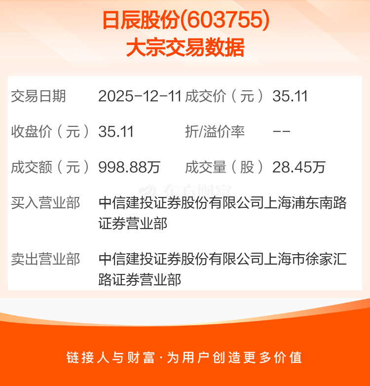 2025年12月11日,日辰股份发生1笔大宗交易,共成交28.45万股,成交金额998.88万元,占其流通市值比例为0.29%。