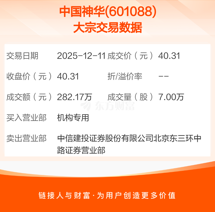 2025年12月11日,中国神华发生1笔大宗交易,共成交7.00万股,成交金额282.17万元,占其流通市值比例为0.00%。