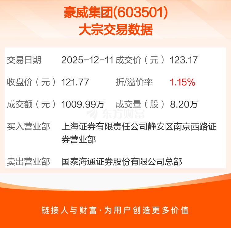 2025年12月11日,豪威集团发生1笔大宗交易,共成交8.20万股,成交金额1009.99万元,占其流通市值比例为0.01%。