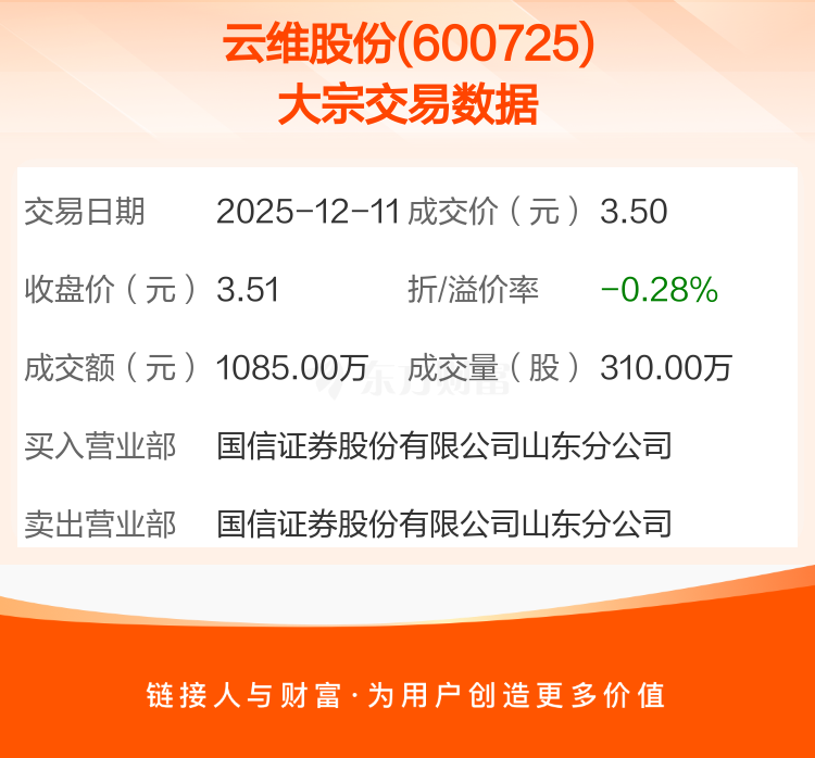 2025年12月11日,云维股份发生1笔大宗交易,共成交310.00万股,成交金额1085.00万元,占其流通市值比例为0.25%。