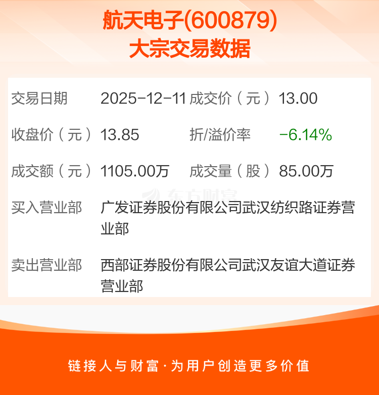 2025年12月11日,航天电子发生1笔大宗交易,共成交85.00万股,成交金额1105.00万元,占其流通市值比例为0.02%。