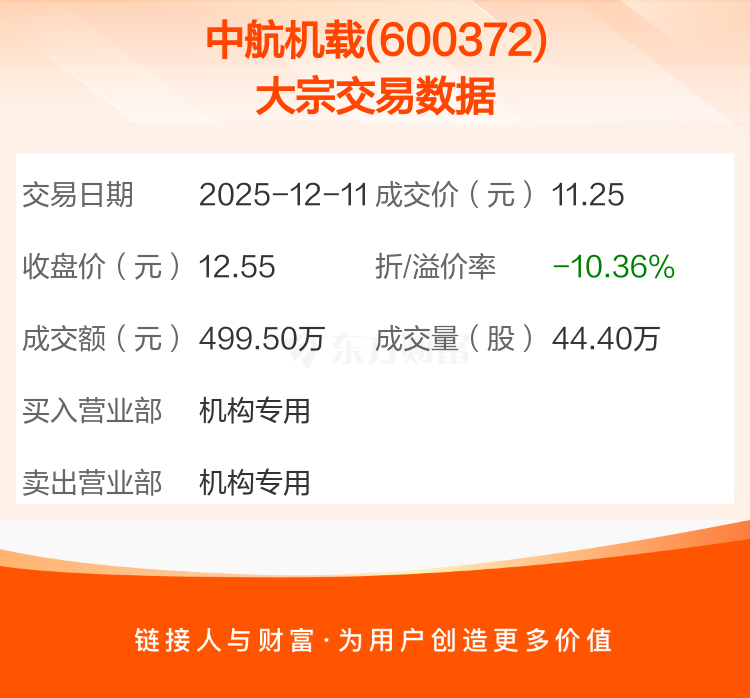 2025年12月11日,中航机载发生1笔大宗交易,共成交44.40万股,成交金额499.50万元,占其流通市值比例为0.01%。