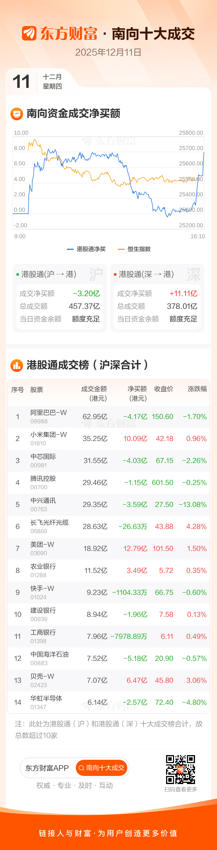 12月11日南向资金净买逾7亿港元,逾12亿抢筹美团-W