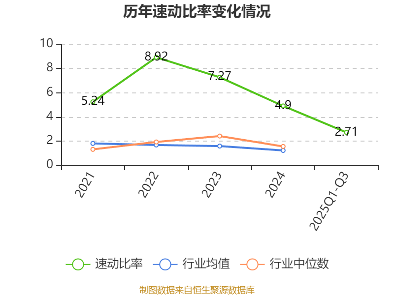2024年,公司流动比率为5.67,速动比率为4.9。2025年前三季度,公司流动比率为3.51,速动比率为2.71。
