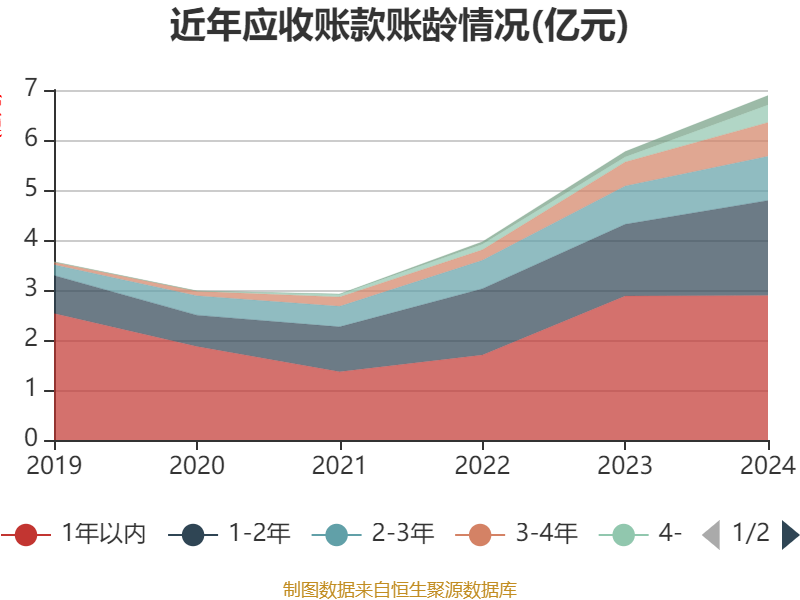 从应收账款账龄结构来看,截至2024年末,公司账龄在1年以内的应收账款余额为2.89亿元,较上年末增长117.06万元,占应收账款总额比例为41.98%,较上年末下降7.96个百分点。