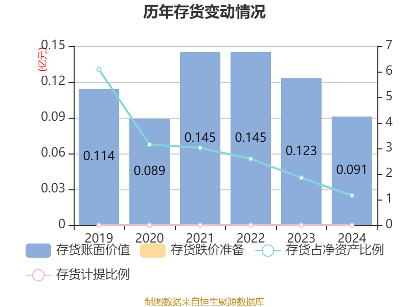 从存货变动来看,截至2024年末,公司存货账面价值为911.82万元,占净资产的1.16%,较上年末减少313.34万元。公司本期没有计提存货跌价准备。
