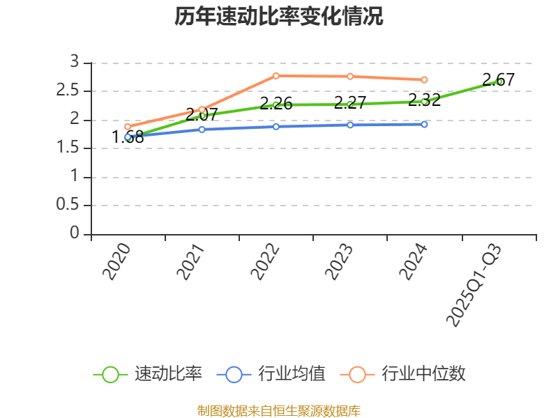 2024年,公司流动比率为2.34,速动比率为2.32。2025年前三季度,公司流动比率为2.71,速动比率为2.67。