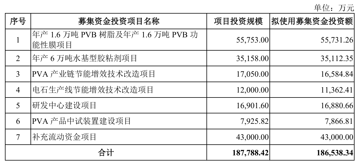 据招股书,公司本次募集资金拟投向年产1.6万吨PVB树脂及年产1.6万吨PVB功能性膜项目、年产6万吨水基型胶粘剂项目、PVA 产业链节能增效技术改造项目、电石生产线节能增效技术改造项目、研发中心建设项目、PVA产品中试装置建设项目以及补充流动资金。 募集资金使用有助于提高公司PVB功能性膜、水基型胶粘剂等高附加值产品的生产能力,增强技术实力,推动节能降耗,降低生产成本,完善产业链布局,从而进一步提升公司核心竞争力和行业地位,在提升公司效益、优化产品结构的同时,能够满足下游新兴领域日益增长的市场需求,加速高附加值领域的国产替代进程,本次融资具有必要性。