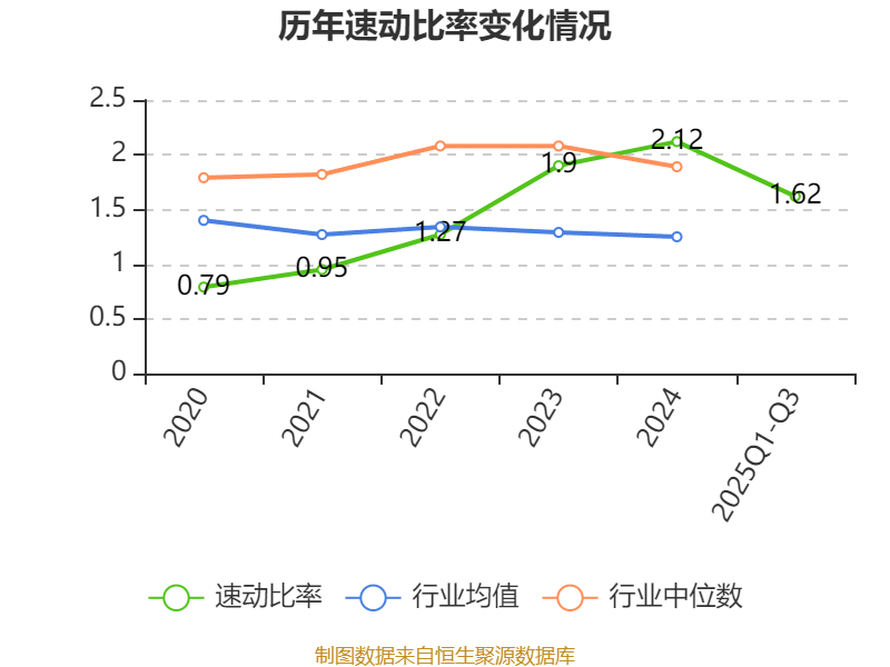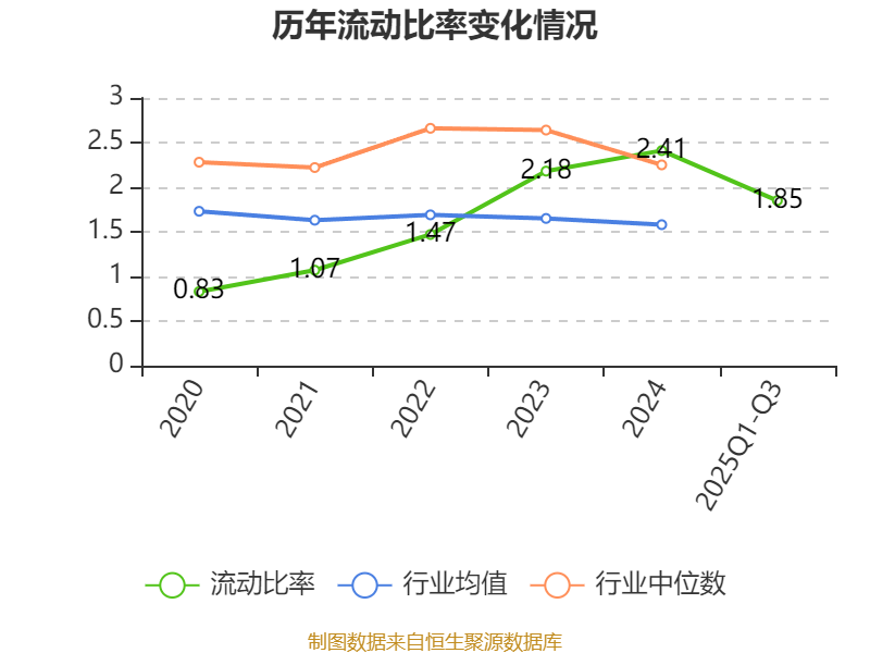 2024年,公司流动比率为2.41,速动比率为2.12。2025年前三季度,公司流动比率为1.85,速动比率为1.62。