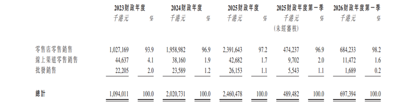 具体来看,在截至2023年3月31日、2024年3月31日和2025年3月31日的三个财年内,龙丰集团来自零售店的收入分别约10.27亿港元、19.59亿港元和23.92亿港元,收入占比分别约93.9%、96.9%和97.2%。到了2026财年第一季度,零售店的销售收入达6.84亿港元,收入占比进一步提升至98.2%。