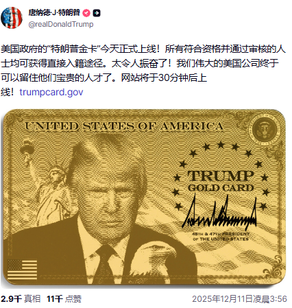 特朗普在社交媒体上称该计划“令人兴奋”,强调新机制将为符合资格并通过审查的申请者提供“一条通往公民身份的直接路径”,并帮助美国企业“留住宝贵人才”。之后,他还预告了即将推出标价为500万美元的“铂金卡”,持卡人可停留最多270天且无需就海外收入缴纳美国税款。