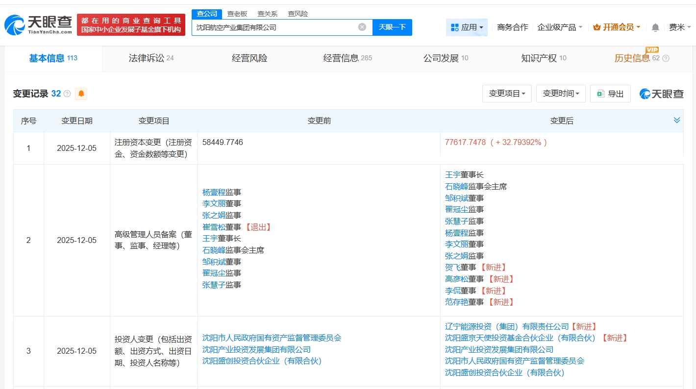 南方财经12月11日电,天眼查App显示,近日,沈阳航空产业集团有限公司发生工商变更,新增辽宁能源投资(集团)有限责任公司、沈阳盛京天使投资基金合伙企业(有限合伙)为股东,注册资本由约5.84亿增至约7.76亿,增幅约33%,同时,多位高管发生变更。该公司成立于2016年6月,法定代表人为王宇,经营范围包括民用航空器零部件制造、以自有资金从事投资活动、航空运输设备销售、物业管理等,现由沈阳市人民政府国有资产监督管理委员会、沈阳盛创投资合伙企业(有限合伙)、沈阳产业投资发展集团有限公司及上述新增股东共同持股。
