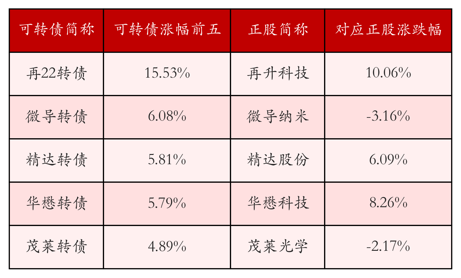南财智讯12月11日电,南财金融终端盘后数据显示,债市方面,中证转债指数收跌0.37%,报481.3,成交额为528.01亿元。可转债方面,今日共成交389只可转债,其中55只收涨,1只收平,333只收跌。具体来看,11只可转债涨幅超过2%。其中再22转债(113657)涨15.53%,微导转债(118058)涨6.08%,精达转债(110074)涨5.81%。今日有27只可转债跌幅超2%,凯盛转债(123233)跌5.85%,华锐转债(118009)跌4.86%,蓝天转债(111017)跌4.8%。存在交易量的可转债所对应的正股中,61只收涨,0只收平,328只收跌。具体来看,4只可转债对应正股涨幅超过5%,其中,再升科技(603601)涨停,收涨10.06%;立昂微(605358)涨停,收涨10.01%。同时所对应的可转债:再22转债(113657)同涨15.53%;立昂转债(111010)同涨1.1%。今日有10只可转债对应正股跌幅超过5%,没有正股跌停。