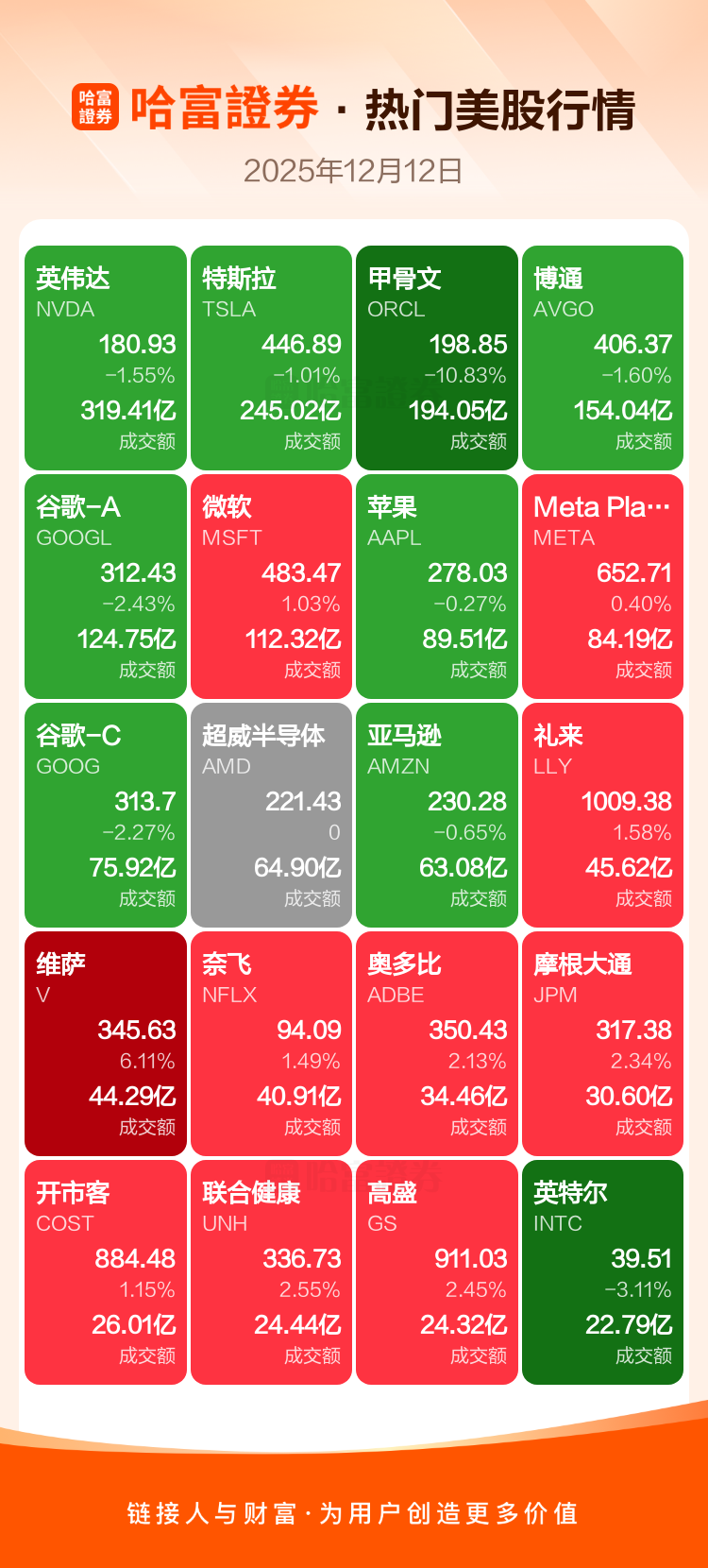 英伟达跌1.55%,特斯拉跌1.01%,甲骨文跌10.83%,博通跌1.60%,谷歌-A跌2.43%,微软涨1.03%,苹果跌0.27%,Meta Platforms Inc-A涨0.40%,谷歌-C跌2.27%,超威半导体涨0.00%。