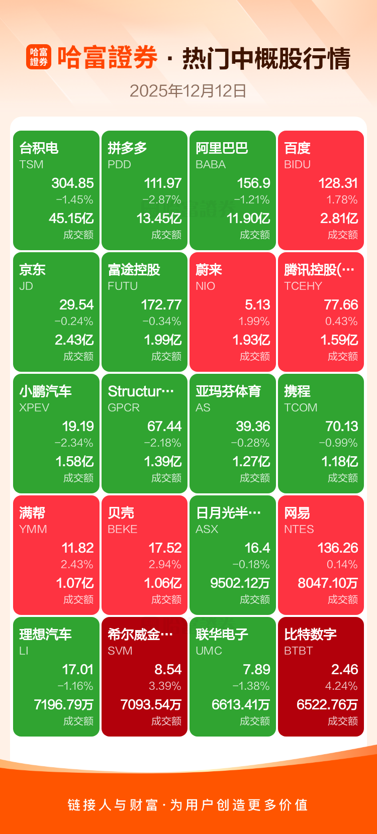 台积电跌1.45%,拼多多跌2.87%,阿里巴巴跌1.21%,百度涨1.78%,京东跌0.24%,富途控股跌0.34%,蔚来涨1.99%,腾讯控股(ADR)涨0.43%,小鹏汽车跌2.34%,Structure Therapeutics Inc ADR跌2.18%。