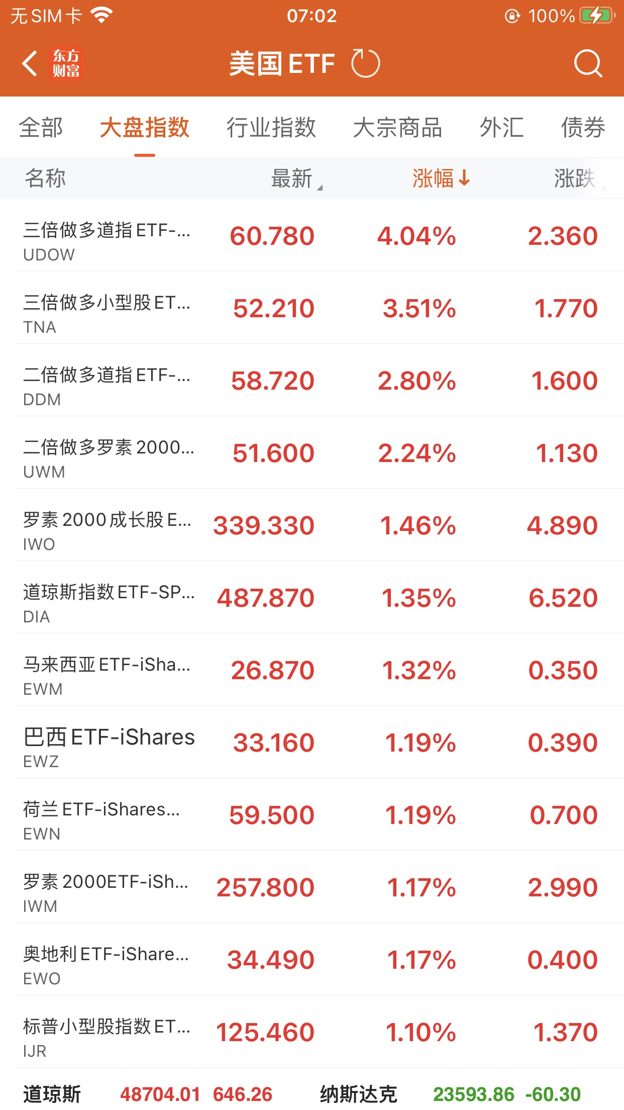 三倍做多道指30ETF-ProShares (UDOW.US) 升4.04%,成交额2.25亿美元。