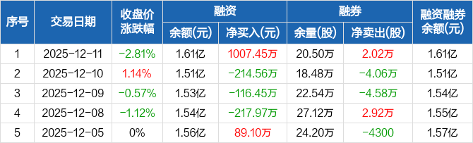 秦港股份融资融券信息显示,2025年12月11日融资净买入1007.45万元;融资余额1.61亿元,较前一日增加6.69%