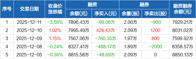 融资方面,当日融资买入1052.52万元,融资偿还1151.58万元,融资净偿还99.06万元。融券方面,融券卖出200股,融券偿还1100股,融券余量2万股,融券余额32.78万元。融资融券余额合计7929.21万元。
