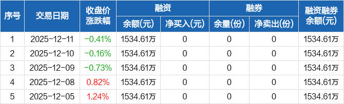 融资方面,当日融资买入8.43万元,融资偿还8.43万元,融资净买入0元。融券方面,融券卖出0份,融券偿还0份,融券余量0份,融券余额0元。融资融券余额合计1534.61万元。
