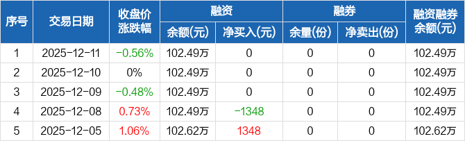 融资方面,当日融资买入0元,融资偿还0元,融资净买入0元。融券方面,融券卖出0份,融券偿还0份,融券余量0份,融券余额0元。融资融券余额合计102.49万元。