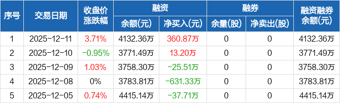 普蕊斯:融资净买入360.87万元,融资余额4132.36万元(12-11)