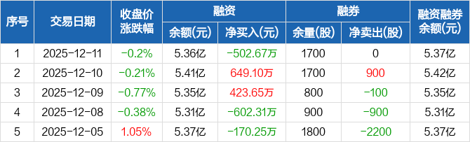 万辰集团:融资净偿还502.67万元,融资余额5.36亿元(12-11)