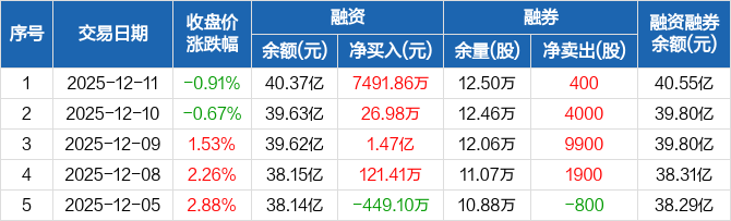 融资方面,当日融资买入2.08亿元,融资偿还1.33亿元,融资净买入7491.86万元,连续4日净买入累计2.24亿元。融券方面,融券卖出2900股,融券偿还2500股,融券余量12.5万股,融券余额1767.84万元。融资融券余额合计40.55亿元。
